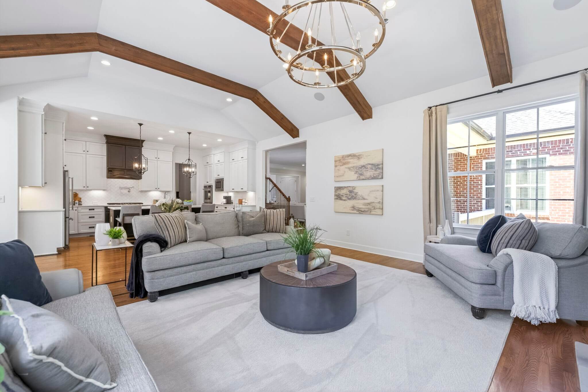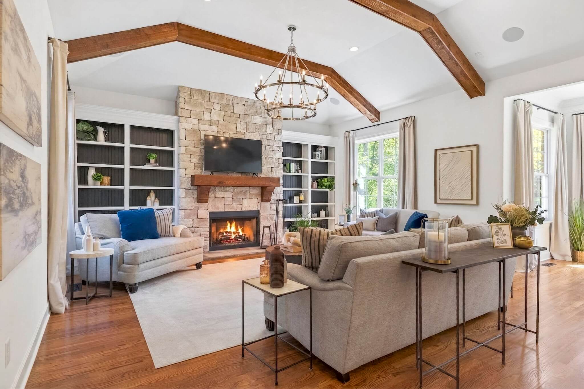 The main living room features stately wood-beamed ceilings and a stacked-stone fireplace.