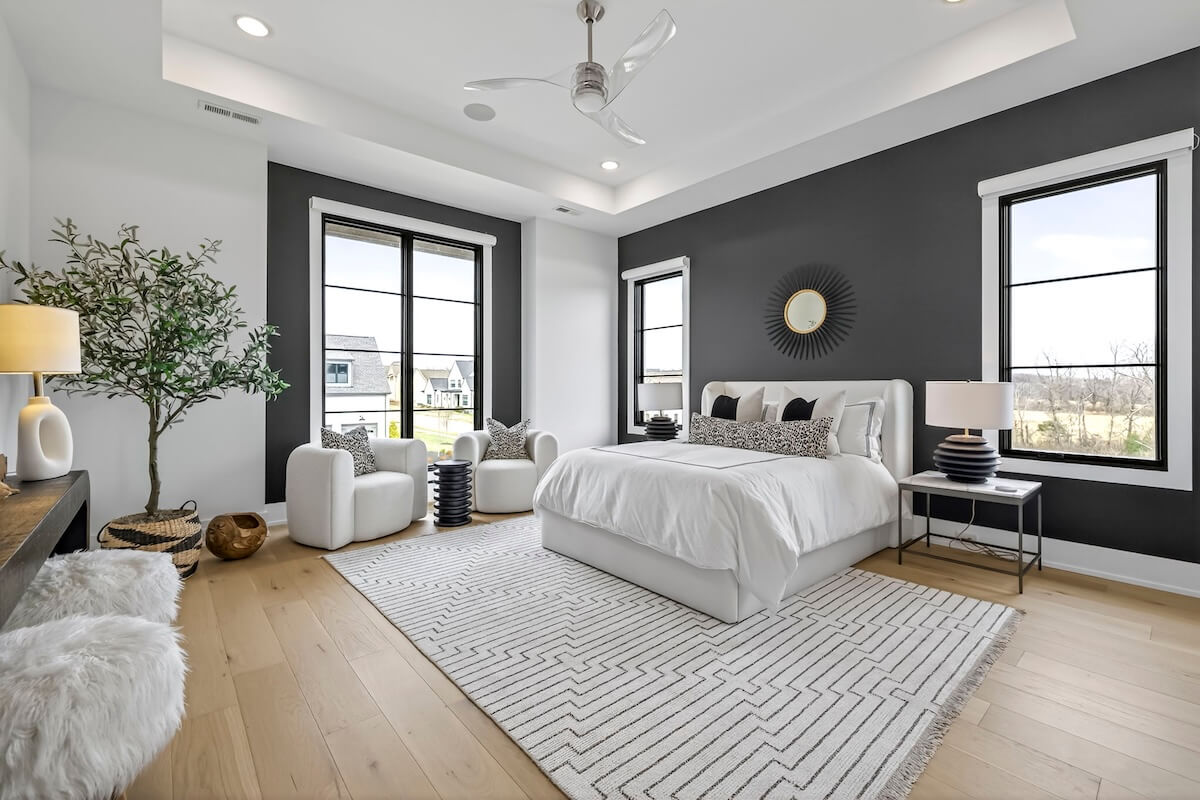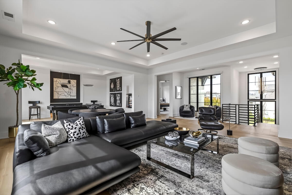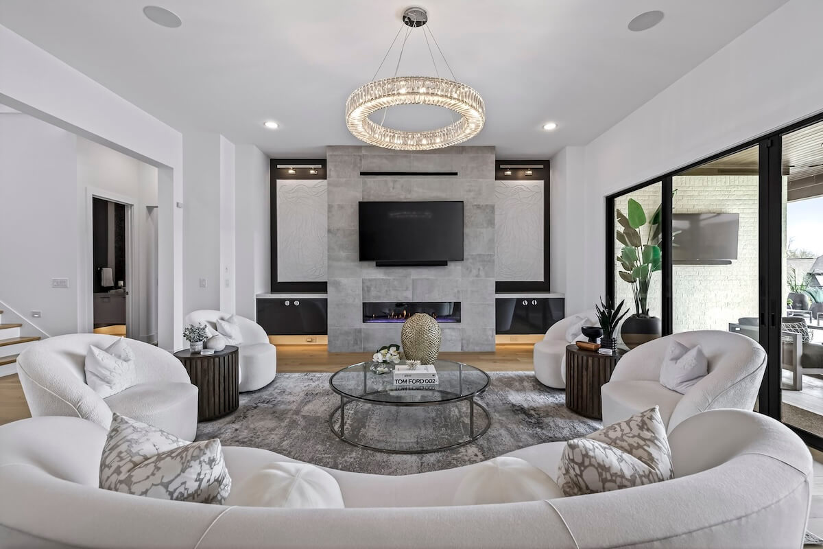 When you step inside, you’ll notice how the four-bedroom home’s open-concept layout seamlessly connects the kitchen, dining, and living areas. Meanwhile, floor-to-ceiling windows and oversized sliding doors flood the home with natural light and offer sweeping views of the surrounding property.