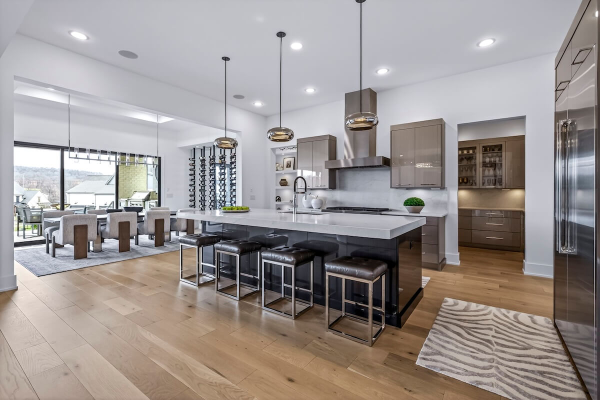 Stepping back inside, the heart of the home is a beautifully designed gourmet kitchen, equipped with frameless custom cabinetry, top-of-the-line JennAir appliances, and a generous chef’s pantry offering exceptional storage and organization.