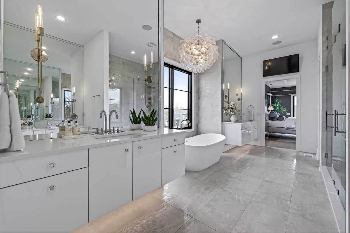 Also on the main level, the owner’s suite serves as a peaceful oasis at the end of the day. Complete with a spa-inspired bathroom, homeowners will love the oversized walk-in shower, freestanding soaking tub, double floating vanities, and the spacious, custom-designed walk-in closet. A private guest suite rounds out the main level, which makes hosting visitors or accommodating multigenerational living comfortable and convenient.